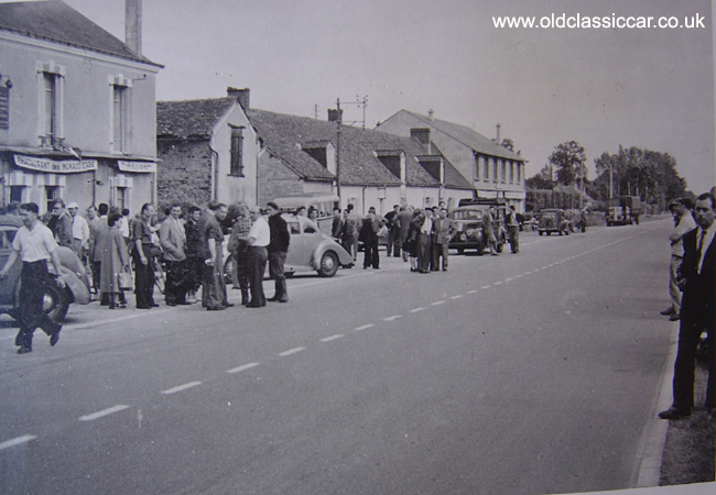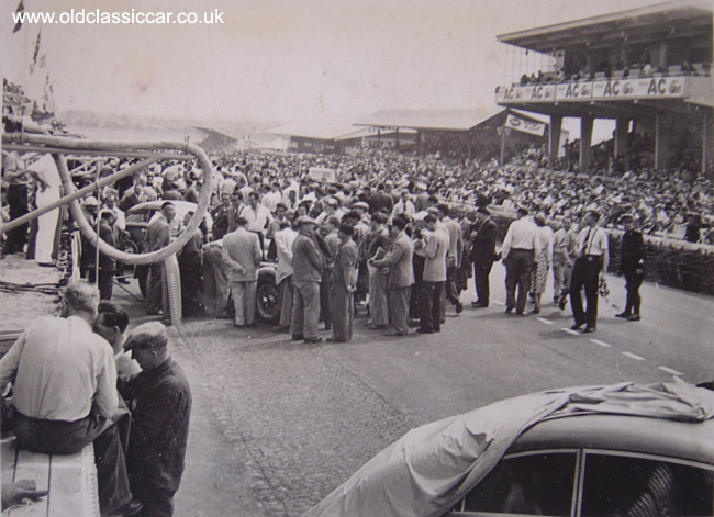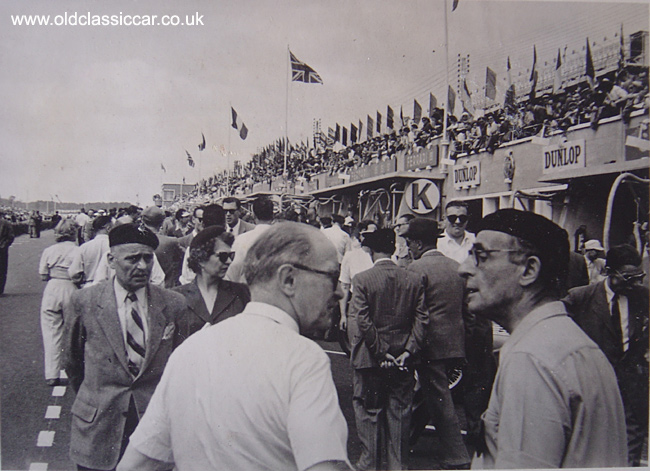 Pitlane. Crowds mill around the garages, with plenty of berets in evidence. Can anyone id any faces seen here?