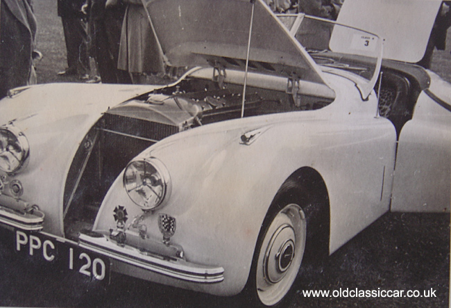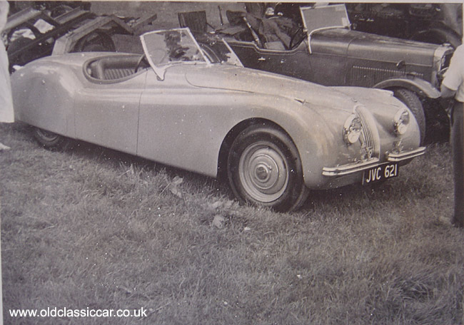 Jaguar XK120. This roadgoing aluminium-body XK120 (JVC 621) roadster was a new-ish car in 1950.