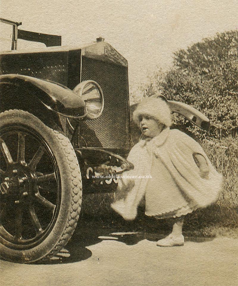 Photo #2 is a charming close-up of the car's front, with a toddler pretending to be taking a swing at the Albert's starting handle. The "A" badge on the radiator can be recognised in this view, as can the tread pattern on the Dunlop front tyre.