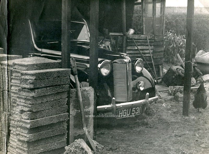 Nothing is known about this car. The photograph sees the Austin parked in a slightly rickety wooden outbuilding-cum-shelter, surrounded by random items scattered about the place. The shiny Austin looks more than a little out of place really, its paint and chromium trim glistening. Was the photo taken at a warm time of the year? Quite possibly, both windscreen wipers have been positioned below the bottom edge of the opening windscreen, suggesting that it had been opened recently for additional ventilation to the cabin.
