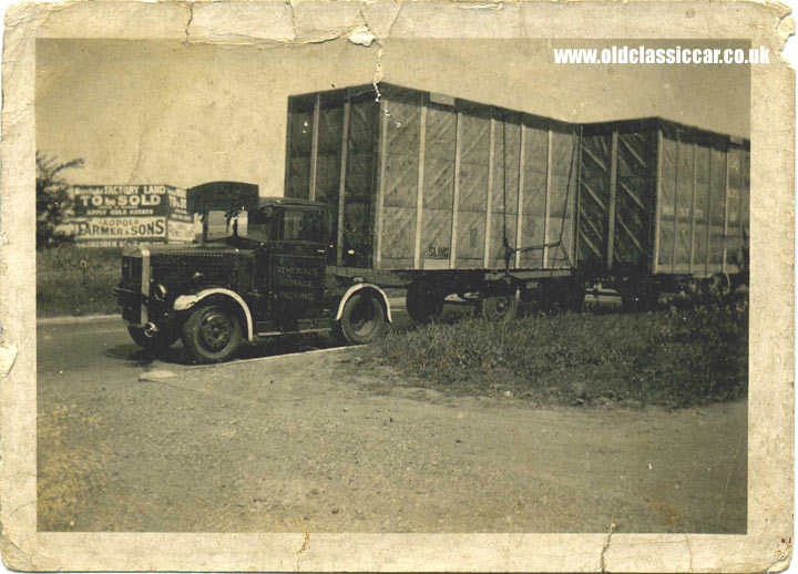 Quite who the company that operated this Beardmore was I'm not sure. The signwriting on the lorry's door advertises their Removals, Storage & Packing service, and also the vehicle's fleet number of 33. There is a headboard over the cab, but I'm unable to make out any of the information presented on it. The trailer to the right of shot appears to feature the word "Minster" on it. In the background are signs advertising freehold land up for sale, by agents Leopold Farmer and Sons of Gresham Street London, who were surveyors and auctioneers.