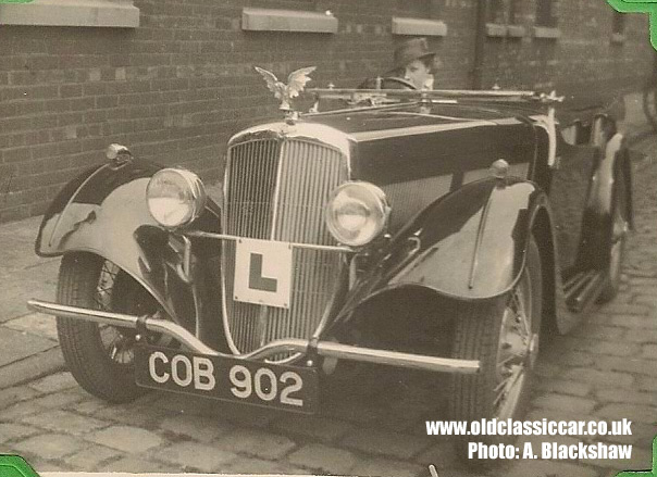 Tony sent the following photograph over, he'd been looking around in the hope that the car's manufacturer could be pinned down. Although I'm not sure which variant it is, the car is another example of BSA Scout, not dissimilar to the car shown above. The registration, COB 902, is a Birmingham issue, dating to late 1936 or early 1937. It was owned by Tony's Grandfather from the 1930s through to 1947. He lived in the Macclesfield area of Cheshire. Evidently this sporting machine was being used for driving lessons at the time of this photo, the hatted young lady behind the wheel perhaps ready to head off down the cobbled street in which it was parked. The screen has been folded, so goggles might have been the order of the day. Can anyone identify the striking mascot fitted to this Scout's radiator cap? My thanks to Tony for sending the picture over.