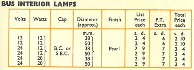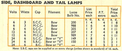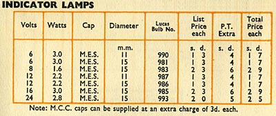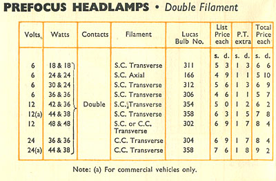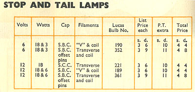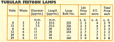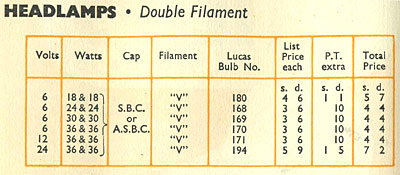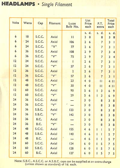 I've scanned a number of tables which describe the motor-car bulbs they had for sale, along with the matching Lucas equivalent part number. The first of these tables is shown below, and the remainder can be viewed by clicking the links that follow on. |