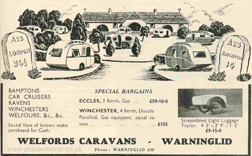 A lovely pre-war advertisement for Bamptons, Car Cruisers, Ravens, Winchesters and Welfours available at Welfords Caravans.