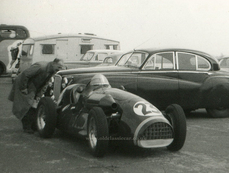 In this snapshot, the car is shown at rest in the paddock. A gent is peering into the car's cockpit, while behind the Connaught towers a mighty Mk7 Jaguar saloon. In the background is a double-decker bus that has had its lower windows panelled in, presumably as a conversion to a racing car transporter. On its side is advertising for Double Diamond ale.