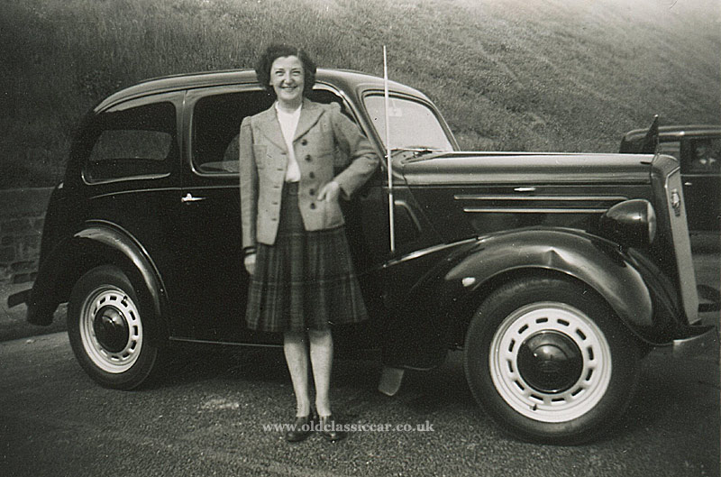The location of this old photo, printed on Velox paper, isn't recorded, but at least enough is visible in it to identify the car as another example of the Mk1 E04A Anglia. A young lady is posed alongside the driver's door, note the scuttle-mounted wireless aerial fitted to this particular Ford. The car appears to be a well-looked after example, therefore I'm sure the owner was somewhat irked when the offside front wing of his prized 8hp Ford received that ding. There appears to be a small flag flying from above the car's radiator grille.