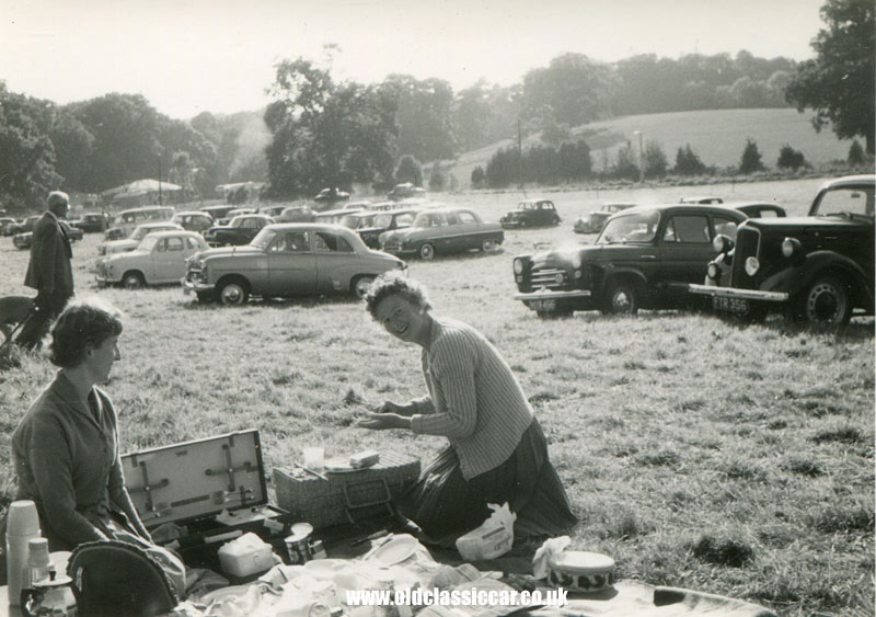 Elsewhere, parked in the same field, are examples of Armstrong Siddeley Whitley, pre-war Morris 10/4 or 12/4, 1950's Minor, E-Series Vauxhall, Austin A35, and a Bedford CA. The two ladies in shot seem to be enjoying their picnic, note the two hampers - one wicker, the other a Brexton type.