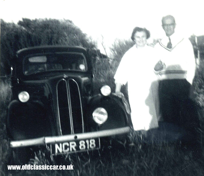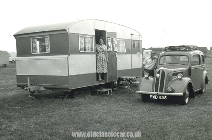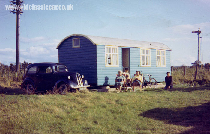 The following four photographs feature a '50s Ford Pop with the family that owned it. The car's registration was PWD 435, a Warwickshire issue. The first photograph shows the Pop parked alongside "Alan's caravan" in 1960, the location was Swalecliff in Kent. The Pop is fitted with a roof rack, auxiliary spot lamp, AA badge, and what looks like externally-mounted semaphore indicators, fitted just ahead of the doors.