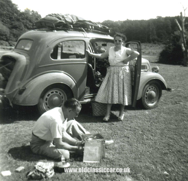 The final photo in this particular quartet shows the Ford Pop parked in the New Forest in 1959, its roof rack well loaded with equipment. Sat on the floor, the un-named gent prepares a Primus stove for action. No doubt the picnic hamper wasn't far away, what a fine way to spend a sunny day.