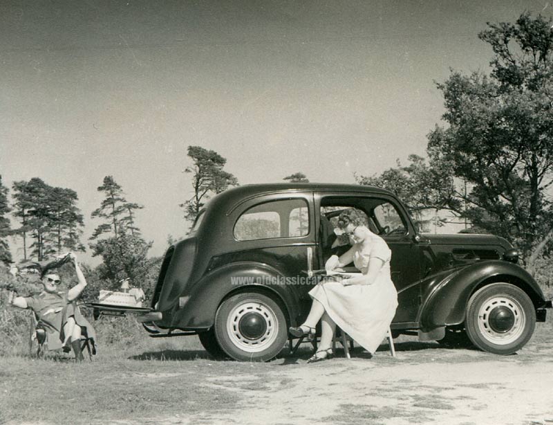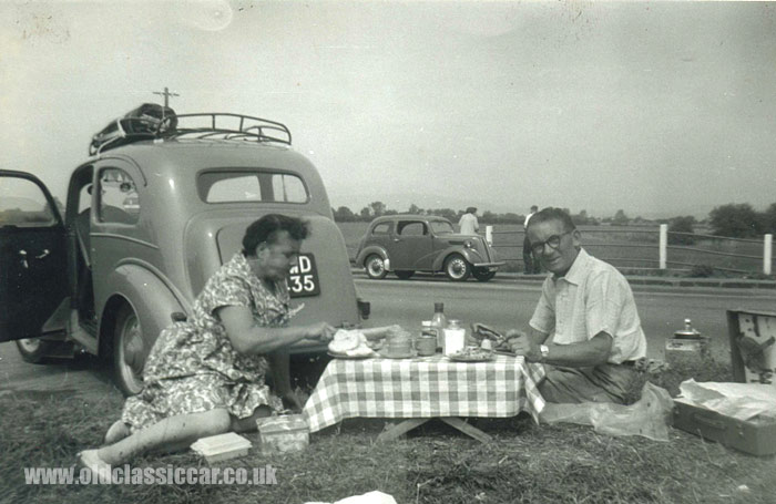 Another venue, another picnic. Once again a fine spread has been laid on. PWD is to the left, while a black Ford 103E has joined the fun. Note the spare wheel strapped into the Pop's open bootlid, and the hinged numberplate mounting on the bootlid doing its job. The black Ford Popular has been fitted with a chrome rear bumper and filler cap, probably sourced from a scrap E494A. Alongside is a two-door Austin A35, painted a light colour but fitted with a non-matching bootlid. Other classics parked in view include a Standard 8, Mk1 Consul, 100E, and a Hillman Husky.