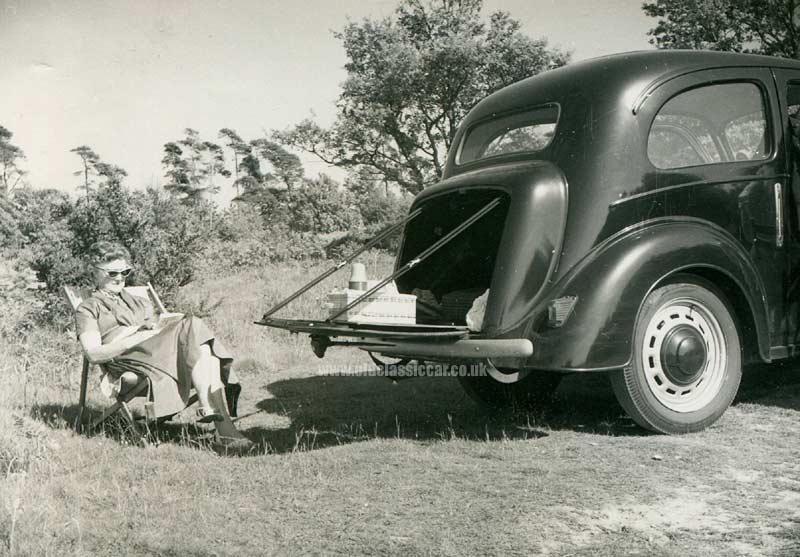 Image number two sees the car in the countryside, accompanied by two smartly-dressed ladies on a picnic. This shot almost has the feel of a staged publicity photo to it, but it's just a regular snapshot of a family who've gone out for a spin, and parked up to enjoy a snack and a cup of tea. This example has been fitted with two extra stop/tail lights, supplementing the original lamp in the centre of the bootlid, seen here lowered with a hamper on top of it - very handy.