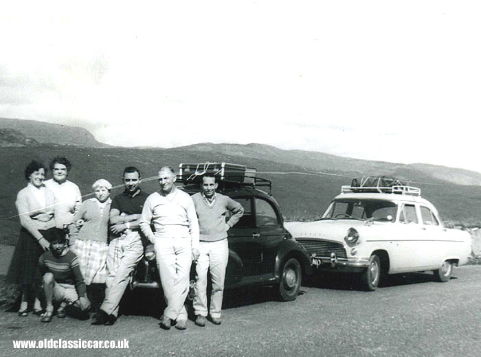 This next shot features two fine British classics - a Morris Minor, hidden behind the group of holidaymakers, and a light-coloured Mk2 Ford Consul. Both cars have been fitted with roofracks, and look well loaded. The only other non-standard fitment on the Ford is a pair of Tex wing mirrors.