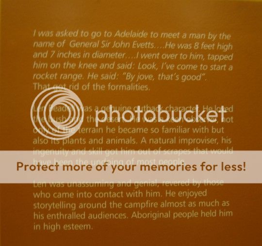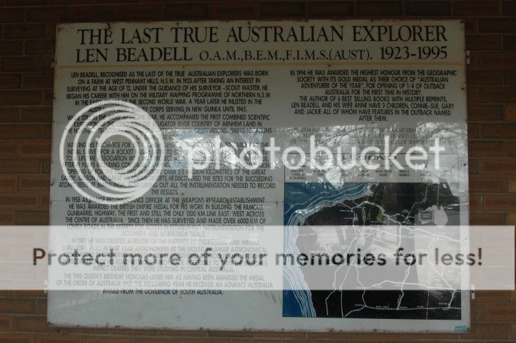 As we looked about, I wondered if there would be any mention of the late Len Beadell. Len had been the surveyor who located and set out Woomera, Emu Field, Giles Weather Station and was instrumental in creating some of the famous outback roads such as the 'Gunbarrel Highway'.