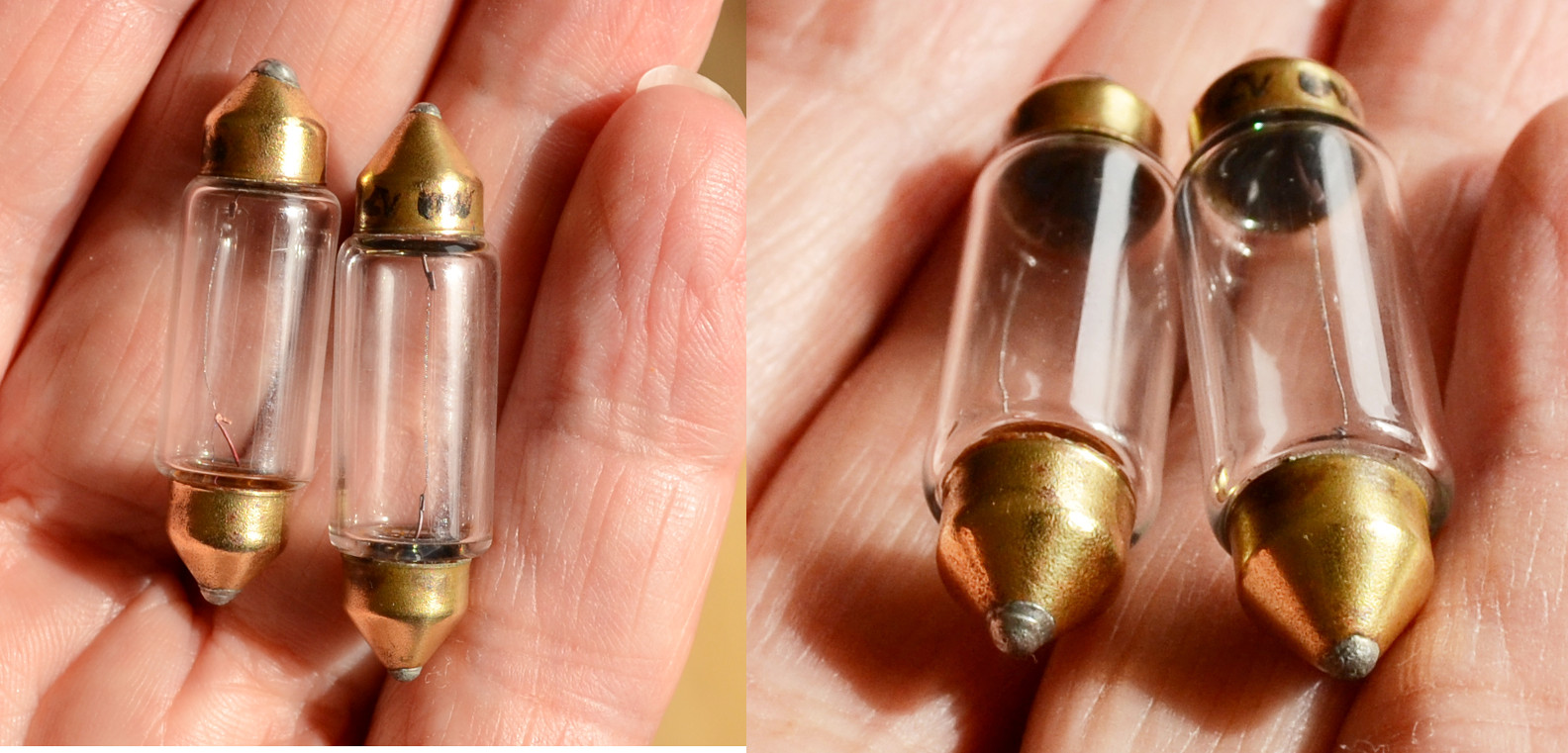 They are, of course, festoon lamps, and very lovely when cleaned with rubbing alcohol and polished up with Brasso. The brass capped ones work perfectly, the cap from one end of the other one fell off during cleaning and I'm trying to get it working again. Here's the 2 'survivors'
