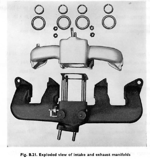 "The intake and exhaust manifolds are attached together at the centre by studs and nuts, and a gasket seals the joint. Circular collars to which gaskets are fitted, locate the intake manifold ports with those of the cylinder head. The exhaust manifold makes direct contact with the head."
