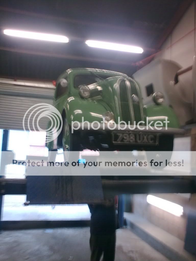 the front was raised first, where the trunnions ( slight lift in the nearside), wheel bearings, tyres, chassis, linkages, exhaust condition and mounting were checked..Then the back, wheel bearings, spring mountings and condition, tyres etc all checked....and ok