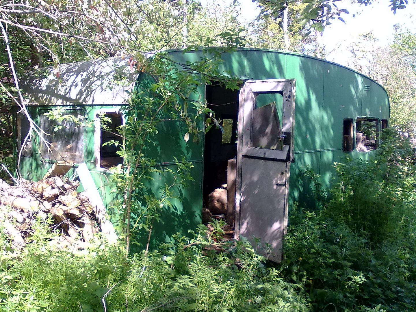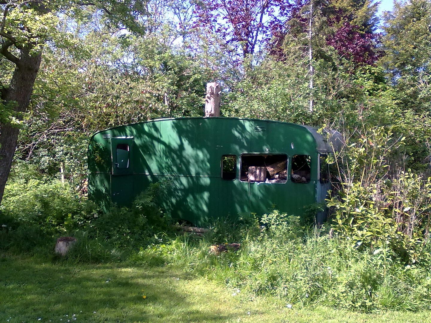 The house we arrived at has a rather large garden and at the bottom of the garden is a caravan half hidden by over-grown greenery.