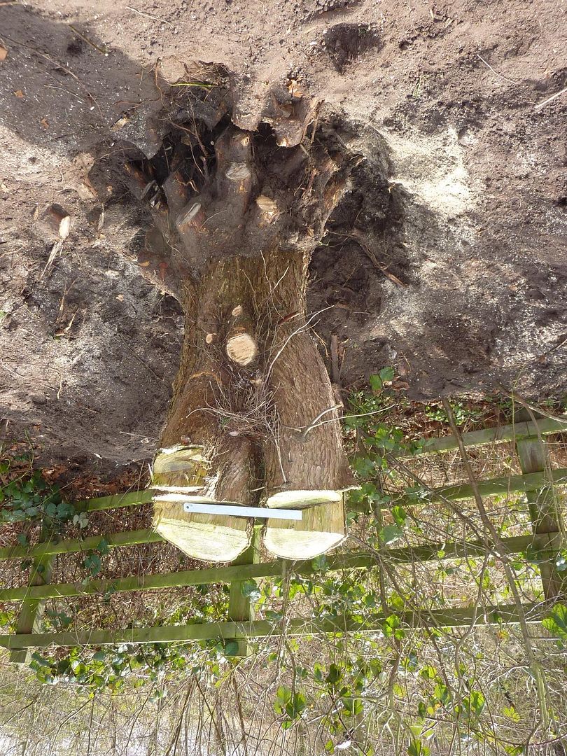 Thanks for the advice; In the end, I thought it best not to tell her to dig it out her self but have cut it down to ground level and put some burning coals on it. I did try a 10 ton "Porta Power" puller, but it only has about 8" of travel and it just dug chains into the wood , tried a couple of" land rover" Hi Lift jacks....but it was obvious what was going to win