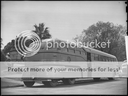 That is the Landliner. It had a Ford V8 engine in the front bogie and another at the rear driving the wheels that end. Steering was via hydraulics, and it seems there were some problems with this. It was built in the town of Frankston for the Peninsula Bus Lines in 1946, but had a short life locally, and it seems that by 1948 it was being used in Western Australia. An amazing and advanced design for just at the end of the war!. Lurking at the right of the photo is a Reo prime mover with its bus.