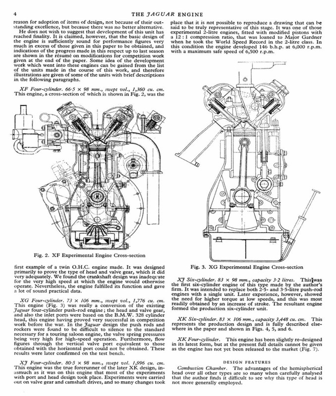 "There are some misleading claims of an intervening "XJ" 4-cyl prototype but it seems the only person who referred to them as such was William Heynes in a paper presented to the IMechE in 1953. Heynes stated there were many 4-cyl variants following the XF but it was he alone who loosely grouped them as XJ. The last mention of XF was in July 1945 and the first mention of XK (XK1) was in October of the same year. This doesn't give much room for a series of XJ engines.There are no mentions of XJ in the archive (other than in Heynes’ paper). If there is a XJ, the first one is likely to have been referred to as XK1 internally. There were three others of nominally 1790 cc capacity called XK2, XK3 & XK4. It is likely these are what Heynes referred to as "XJ". The first "true" XK was called "XK Number 1" (distinct from "XK1") and was of 1970 cc nominal capacity with an 83mm/91mm bore/stroke." _________________ https://www.nostalgiatech.co.uk