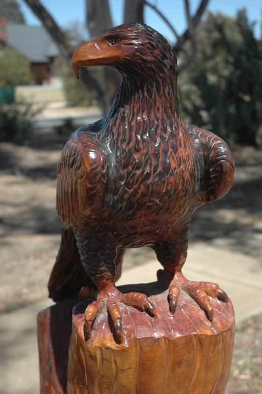 We set off once more, passing through the town of Minyip which had been used as the setting, under a different name, for the T.V. series ‘The Flying Doctors’. We had no reason to stop so continued to Rupanyup and the last painted silo of the chain. Beside the silos the long closed railway station building sat simmering in the sunshine. Also in the town were two very impressive wood sculptures, apparently the start of a further collection.