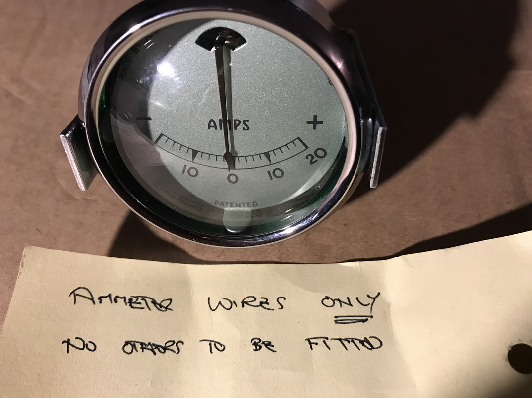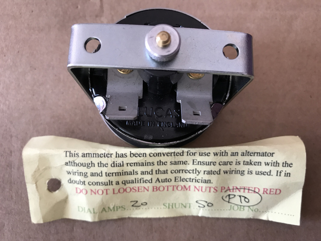 "........on an original BM ammeter with the shielded grub screws there is only room for the larger alternator size cables. what We have converted with a 50 amp shunt inside is based on a similar Lucas ammeter. The ones we do for Jagaur XK120/150 have terminals for just the one in and one out wire..."