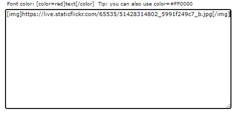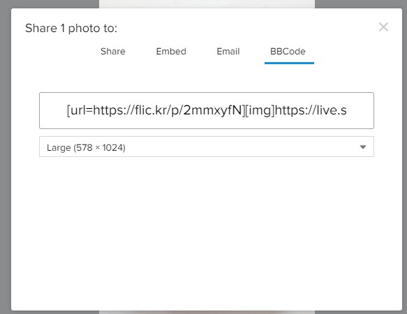When you have the image open in flickr, click on the "share" box and pick "bbcode" from the different sharing options. You should see this, where you can pick the image dimensions that you want to share: