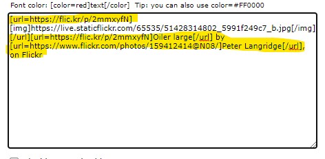 Hope that helps a bit. It'd be nice if Flickr would just provide the IMG tags without the surrounding link back to itself, but I can't see a way to do it and lots of other image hosting sites do this too. Not sure why the forum gets upset about it, unless there's a problem with posting links. Don't click on "disable BBCode in this post", that's the thing that allows the IMG tags to work.