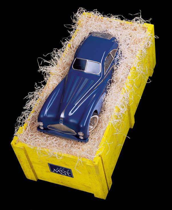 Forties-style autominiature on a scale 1:6 made in Germany by our company MST Magic Super Toys. It took us more than 15 years to develop the car. Each car is handcrafted using parts of pressed steel, formed by the aid of a set of moulds on a 650 tons press, or casted aluminium (seats, bumpers, steering wheel etc.). There is no plastic on the car except the "glass" of the head- and taillights and the windows.