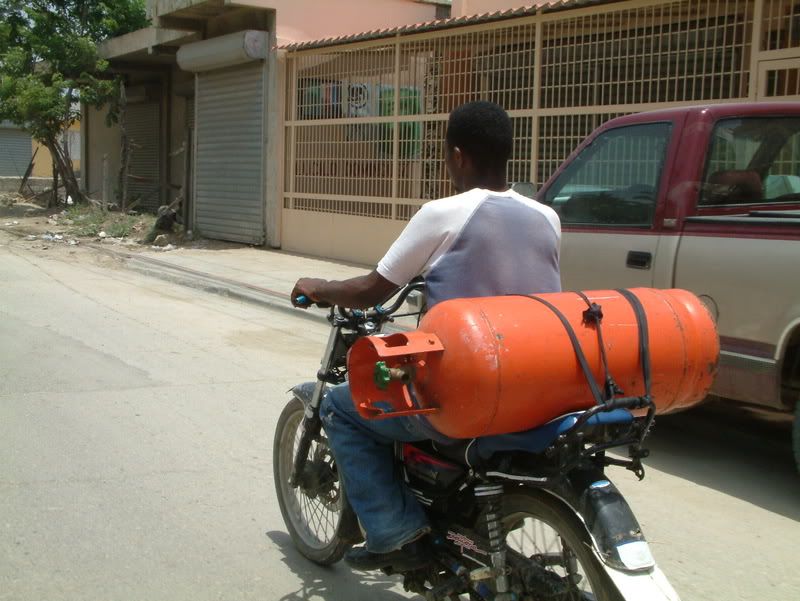 I took this pic in the Dominican Republic a couple of years ago; I thought gas cylinders were supposed to be transported upright? or may be its a diy LPG job