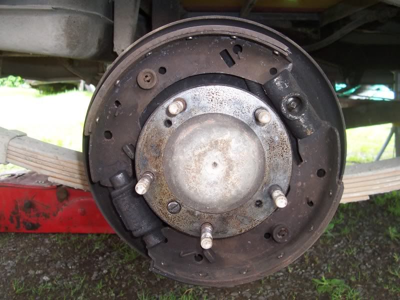 the handbrake linkage reminds me of an mgb arrangement, the wheel cylinder is held on with a circlip and located with a rollpin like the mgb but its heavier duty and the adjuster is huge