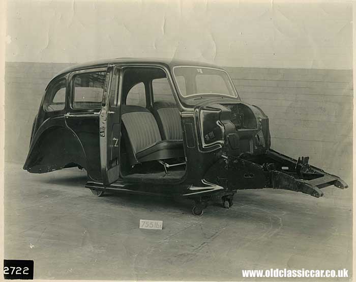 The second photo shows the car's production at a more advanced stage. The main body has been welded together, the trim has been fitted and the glazing installed, ready for the mechanical components to be bolted on. A similar style of photograph, number 2724, features the bare bodyshell of a c1937 Hillman 14, and that can now be found on this page.
