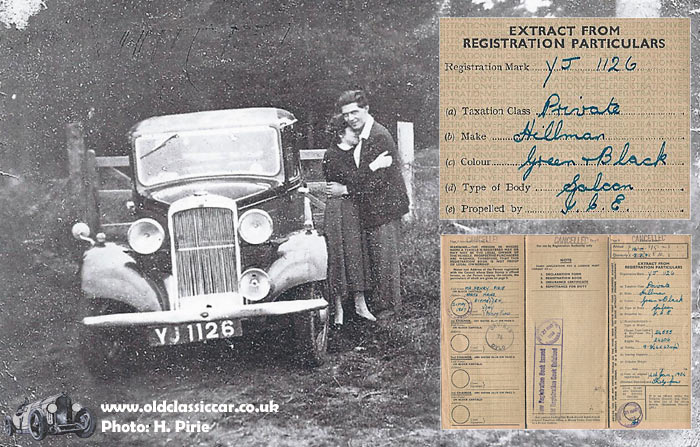 two-tone black and green, was rated at 9.8HP for tax purposes when new, and was registered on 4th January 1934, and therefore built towards the end of 1933. The first photo shows Henry, with a young lady, stood alongside the Hillman saloon. Some of the details from the logbook are also included.