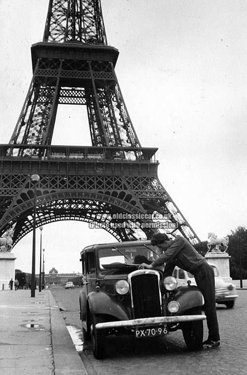 The final photograph in this set is great, and my favourite of the lot. The owner peers beneath the bonnet of his venerable old Hillman in this scene, pondering its workings, while in the background the towering presence of the Eiffel Tower looks on. A much more modern Renault 4CV speeds by. My thanks to Leo and his friend for permitting me to share these fabulous images on the site.