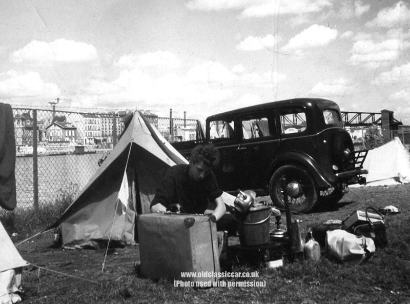A fabulous camping scene now sees the Minx parked alongside a small tent and a large collection of camping accessories. A large river - the Seine perhaps - is in the background.