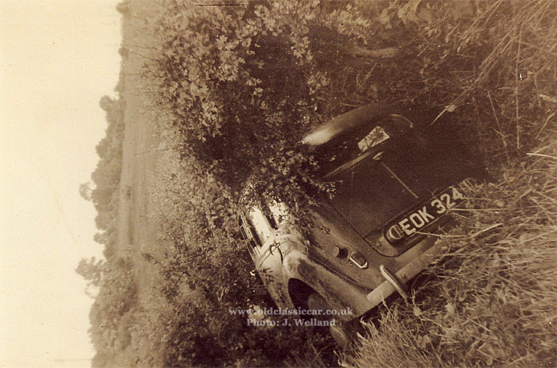 Jenny sent scans of the following three photos, from a varied collection of original photos that she has from the days when her father owned and ran Welland's Garage, in Burnham-On-Sea. This trio document the recovery of Hillman Minx registration EOK 324 (Birmingham reg., 1938) from a Somerset hedgerow. In the first, the very poorly Minx is shown partially on its side, parked nose-first into the undergrowth. Clearly the car's occupant(s) would have climbed out through one of the nearside doors.