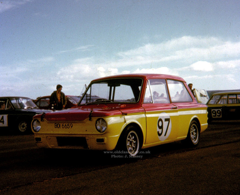 This yellow and red Imp, BOI 6659, running as car 97 on proper Minilite wheels, belonged to George Windrum and was sponsored by Simms Steel. Thanks for the picture Julian.