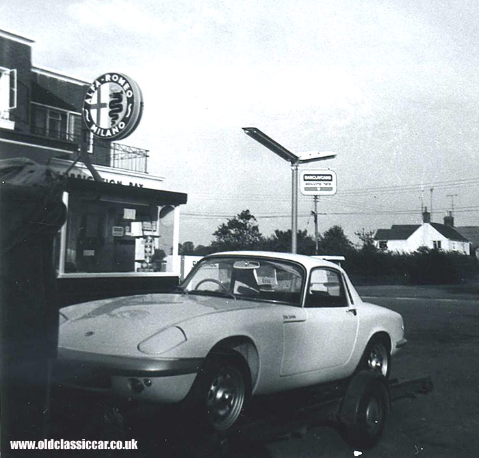 Notes on the back of this Lotus Elan photo advise that it was captured on film outside Rob Walker's Alfa Romeo garage, in Corsley, Warminster, during August 1967. The Elan, fitted in this case with the knock-on steel wheels, is seen on a trailer. Given how clean the Elan looks under the wheelarches, suggests that it was brand new at the time, perhaps being delivered to the garage. A Castrol oil cabinet, and a pair of 1960's Esso petrol pumps, can be made out in the background, as can the imposing "Alfa Romeo Milano" sign above the Lubrication Bay.