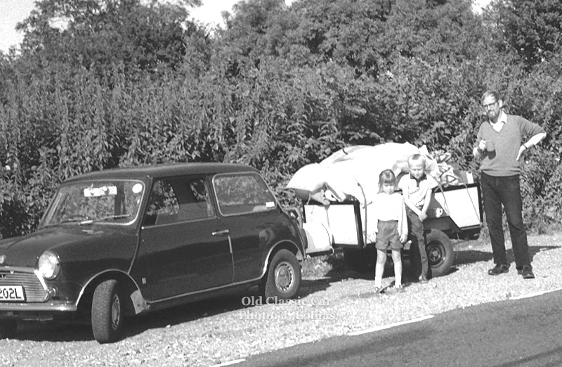 The 'L' registration Mini was Mallard Green, and is shown here towing a well-laden trailer somewhere between Shepton Mallet and Blandford, on a trip that
