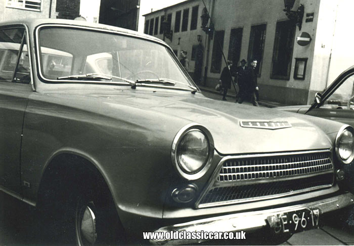 Now, a front three-quarter view of a LHD Ford Consul Cortina (Mk1) in a car park. The photo isn't dated but I assume it's from the mid-1960s, the car looks to be in good clean condition, although the front bumper and numberplate bear witness to some less-than-successful parking manoeuvres.