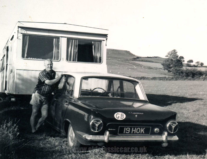 Next, a four-door Mk1 Cortina Deluxe, registration number 19 HOK, displaying its distinctive rear lights. The Ford is shown parked in front of a large static caravan, somewhere in Europe. Whoever owned the Cortina liked his or her motoring accessories. A close look at the car reveals a stick-on rear window demister panel, while sat on the rear parcel shelf is the ultimate 1960's add-on, in the shape of a nodding dog. The HOK registration series was first used in the Birmingham area, in July 1947, although this incarnation dates to early 1963.