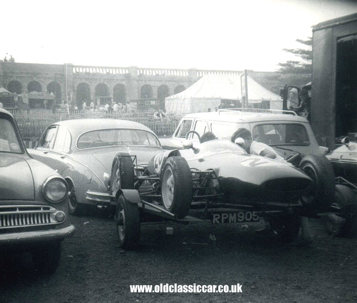 This next black and white photo shows a Mk2 Jaguar, sporting the appropriate registration RPM 905, parked in a 1960's race paddock, with a trailer hitched to the back, and a single seat racing car (Lotus 21? or 24 perhaps?) perched upon it. Does anyone recognise either car, or know who owned RPM 905? Alongside the Jaguar to the left is a Hillman, while to the other side is a rare Mk2 Ford Consul estate car (by Farnham), also with a trailer and race car behind it.