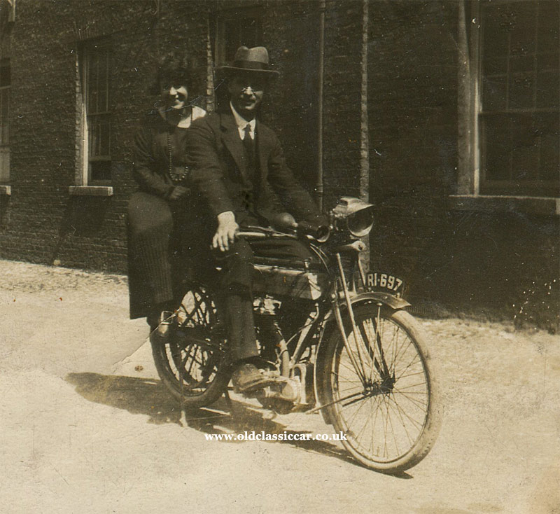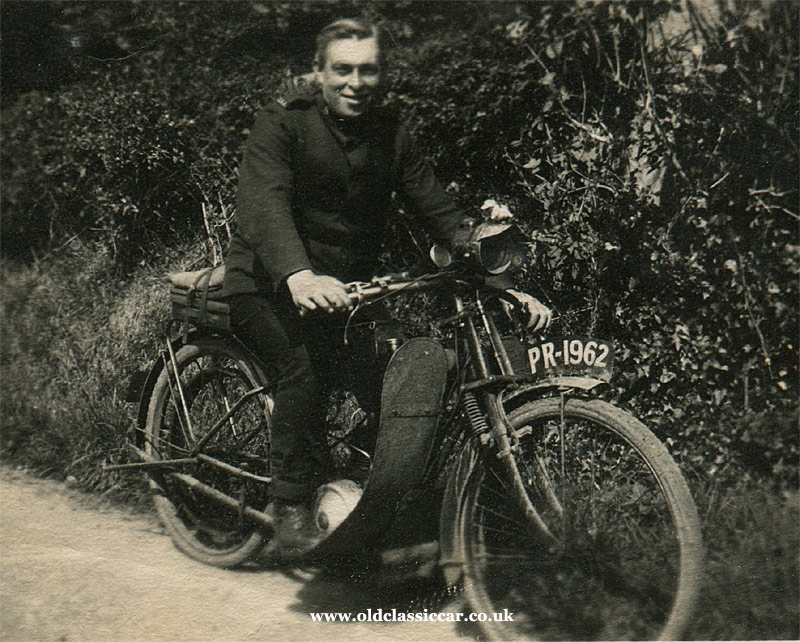 Next, a chap on his own this time, astride his prized machine. Registered PR 1962, it was first used in Dorset. This series ran from January 1923 to December 1927, putting this machine at about 1924 or thereabouts. The rider - no flat cap or other headgear in evidence this time - appears to be wearing a uniform, if the epaulets on his shoulders are anything to go by.