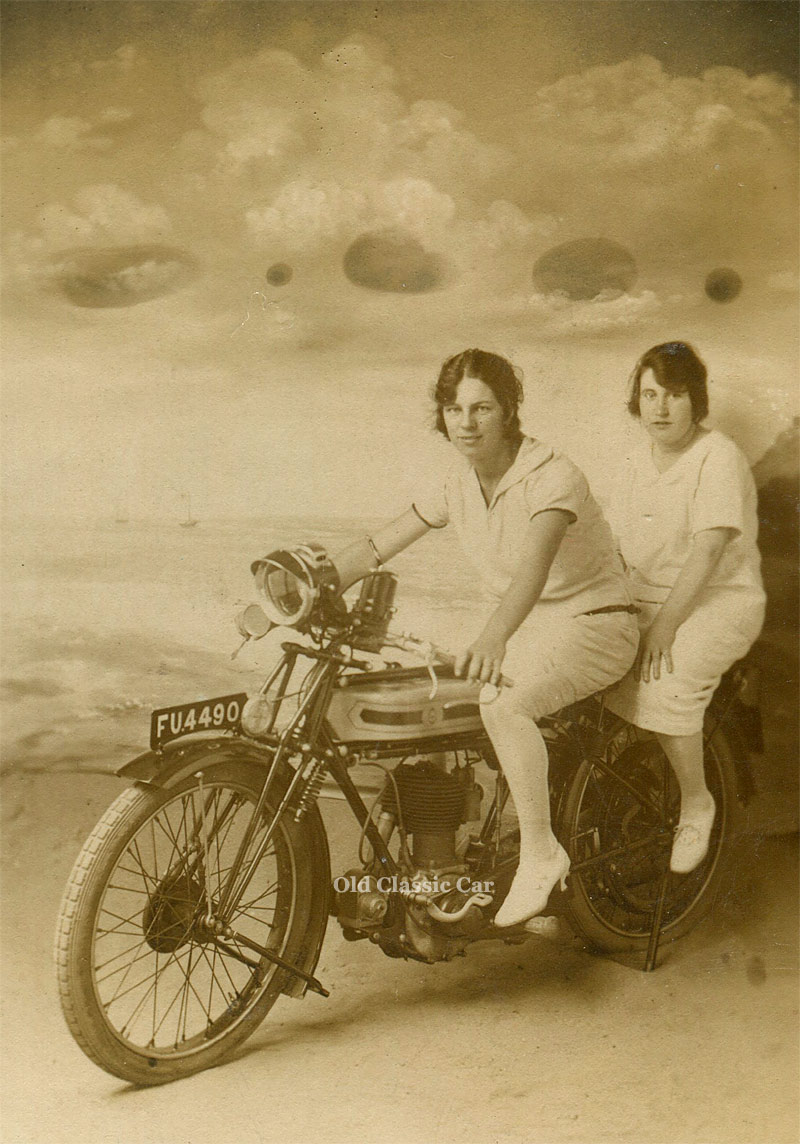Looking very closely at a high-res scan of the following photo, I think reveals the legend "Triumph" on this machine's crankcase. The location is a photographer's studio, in the 1920s. It was quite common for such studios to have a motorcycle, or a small car, posed in front of a painted backdrop, on/in which members of the public could pose for a snapshot. Here, two ladies - named Elsie and Flo Chamberlain - stare, sitting as still as possible, while the camera operator weaves his or her magic behind the lens. FU 4490 is the Triumph's registration, this is a Lindsey (Lincolnshire) issue from the mid-twenties. The motorcycle looks to be in good order, although a few exertions on a foot pump attached to the rear inner tube wouldn't go amiss.