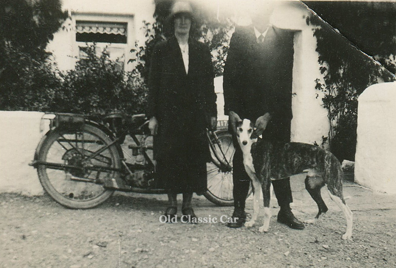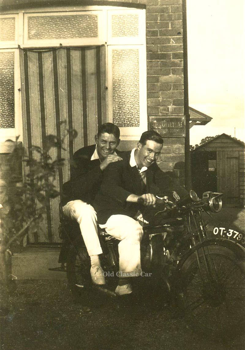 A sepia snapshot probably from the 1920's opens this page. Two motorcyclists in their riding overalls and flat caps, stand by their (as-yet unidentified) bikes. Perhaps they were preparing to go out for a Sunday afternoon's blast down the lanes, stopping for a swift refresher at an out-of-the-way public house, or maybe they'd just returned from a ride out. No notes accompany the photograph, although judging by the age difference of the two gents, it may well be a father-and-son shot.
