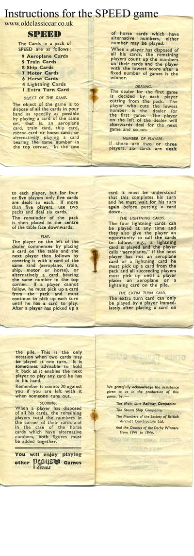 The cards inside are beautifully illustrated, not just with motorcars, but also propeller aircraft (such as the Hawker Tempest, Bristol Brabazon and Handley Page Hermes), jet planes (Meteor and Vampire), ships (including the Queen Mary and other passenger & military vessels), race horses, steam locomotives, and even lightning (well, it is quick after all). The cars chosen are all of a sporting or competitive nature - hence the inclusion of the twin cam Austin Seven racer, Dobson in his ERA single seater, Seagrave's Golden Arrow & Eyston's Thunderbolt land speed cars, plus Campbell's Blue Bird, Cobb's Napier Railton (still going strong even today), and a glimpse of early drivers at the Tourist Trophy race of 1905. The objective of this game is to dispose of your own cards in the quickest time possible. Judging by the machines that appear in this card game, I'd estimate it was produced in the late 40s (the Brabazon airliner first took to the skies on a test flight in September 1949). I've a few other card games that feature motoring, and I'll add a page all about this subject soon. After a request from a visitor to this page, I've scanned in the instructions for the SPEED game - they can be viewed here. Board games.