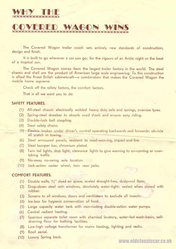 The badge fitted to the caravan shown looks to be very ornate indeed, and seems to hark back to the early pre-automobile days of caravanning. The manufacturer was obviously eyeing up not just the UK market either, with its "Ready for the Roads of the World" slogan that is also visible. The first page, headed "Why the Covered Wagon Wins", goes into some more background detail, and also draws attention to an interesting fact about these wagons, the fact that they had Anglo-American origins... "The Covered Wagon trailer coach sets entirely new standards of construction, design and finish. It is built to go wherever a car can go; for the rigours of an Arctic night or the beat of a tropical sun. The Covered Wagon comes from the largest trailer factory in the world. The steel chassis and shell are the product of American large-scale engineering. To this construction is allied the finest British cabinetcraft - a combination that makes the Covered Wagon the mobile home supreme. Check off the safety factors, the comfort factors. That is all we want you to do. SAFETY FEATURES