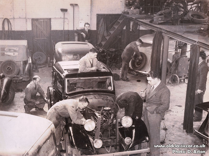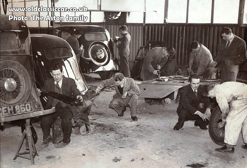 furthest away is having its paintwork attended to. Co-owner Bill Aston is stood to the right (in the tie), while Ted Aston and one of the mechanics