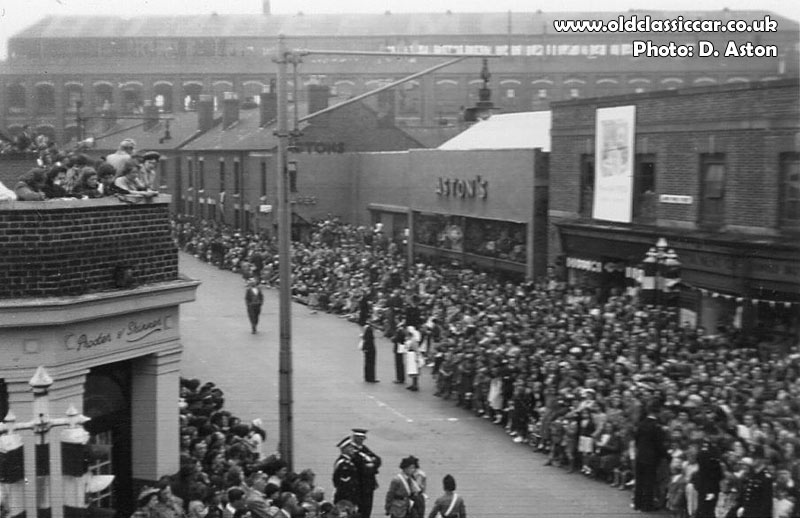 A snapshot now of crowds milling around in the street, with an Aston garage in the background. It too has a raised upper display area looking out towards the road, and an RAC agency sign hanging outside. Note the huge building in the background, and in the foreground a building bearing the name of "Procter and Skinner" above its entrance.