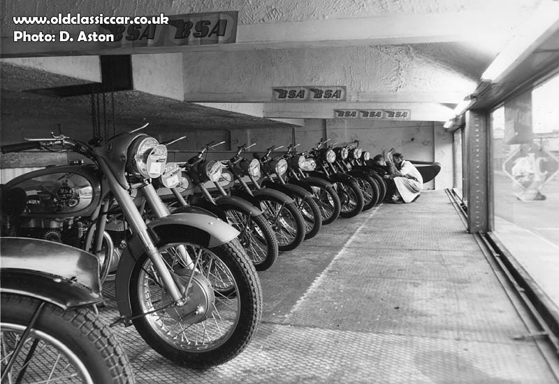 The last of this set of images sees a line-up of new BSA Bantams on display in a raised, mezzanine, showroom. The roof structure doesn't match that of the Lower Ford Street garage, although the patterns on the wall do. An RAC sign hangs outside.